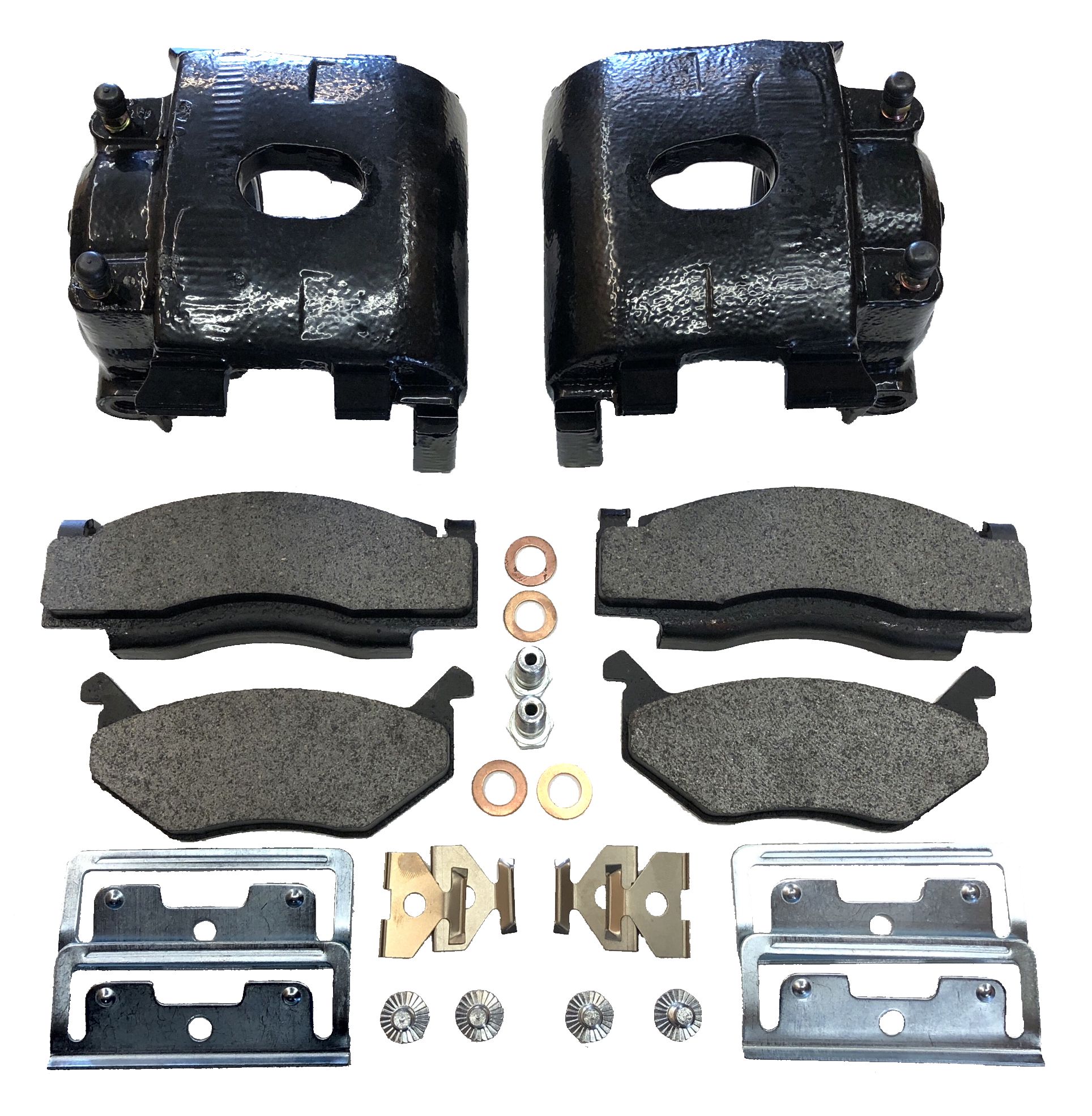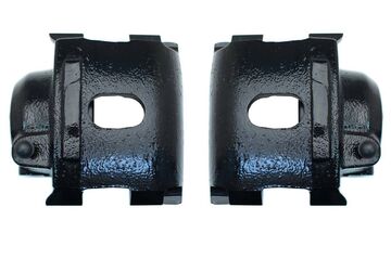 BLACK powder-coated front calipers fit '73 and newer SLIDER type caliper brackets found on many Mopar A,B,E,F,M,J and R bodies equipped with original or OEM type Mopar front disc brake conversions.