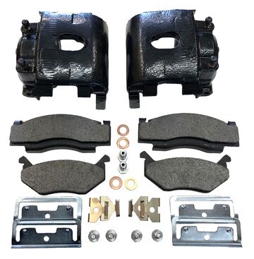 Pair, NEW 2.75" bore '73-'89 Mopar front SLIDER type calipers are assembled with brake pads and clips.